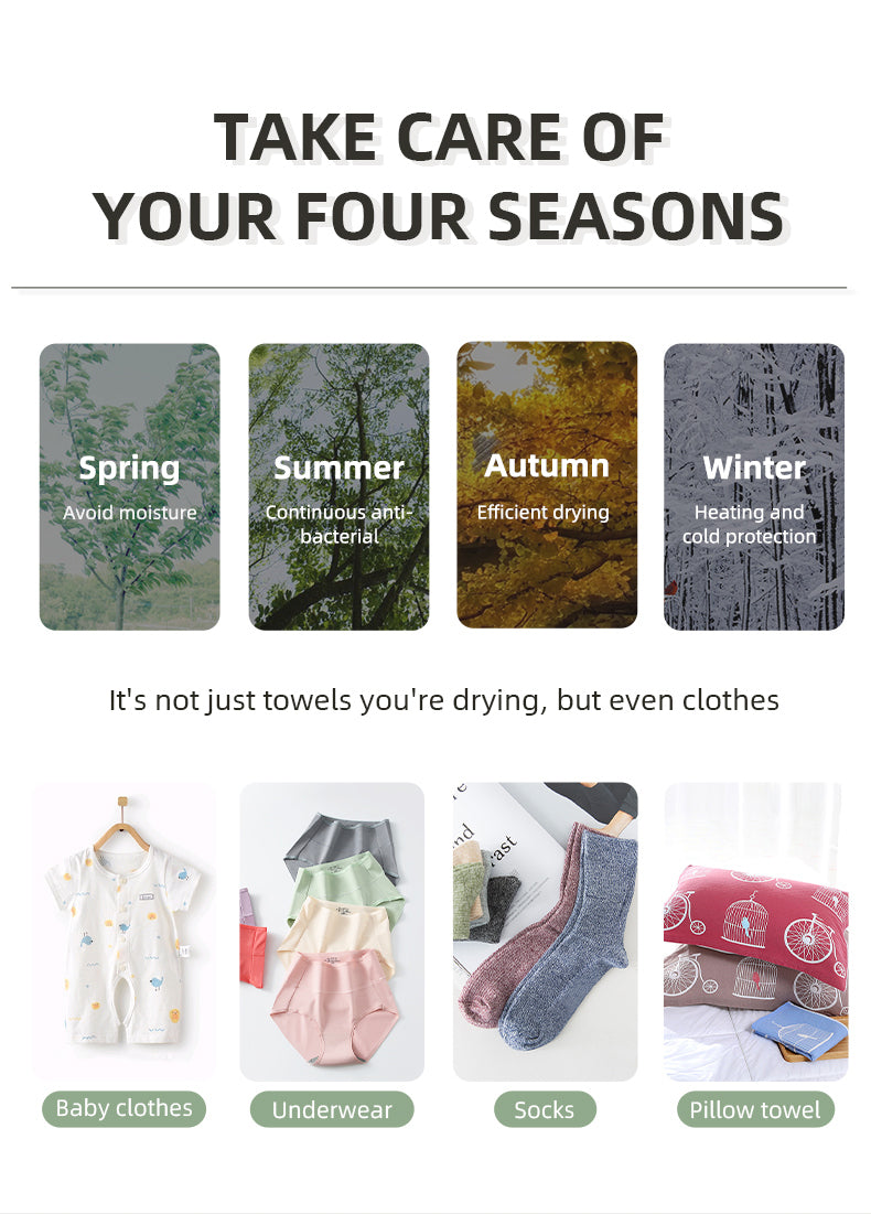 Smart Adjustment: You can set the temperature and timing according to your needs. The LCD touch screen can help you know the temperature of the towel rail at all times.Available in four seasons